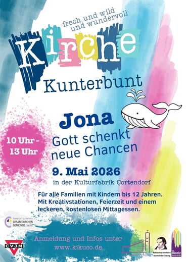 herzliche Einladung zu unserer nächsten Kirche Kunterbunt in der Kulturfabrik Cortendorf am Samstag, den 9. Mai 2026. Das Thema lautet diesmal "Jona - Gott schenkt neue Chancen".